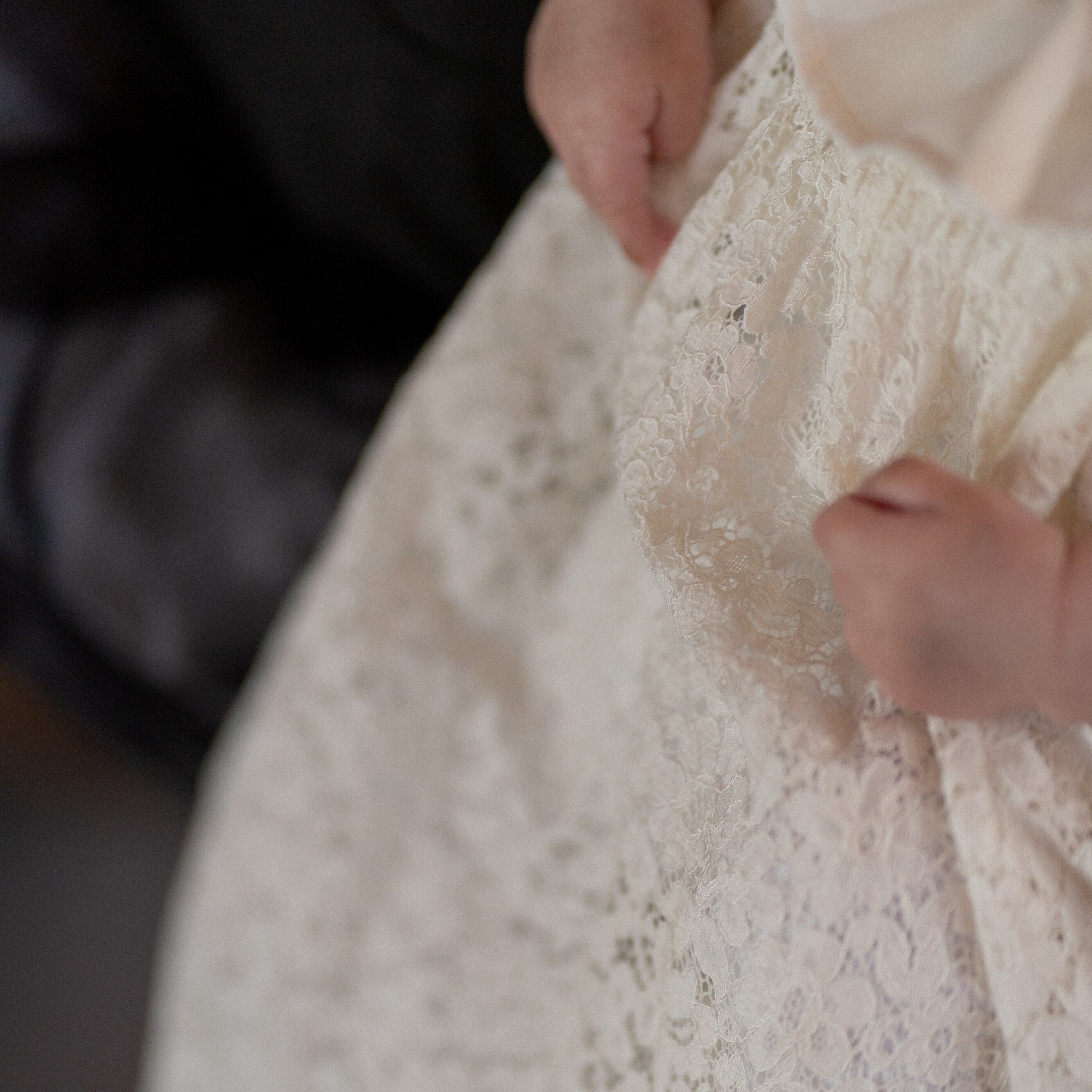 クリーム色の繊細なレース生地で作られた、ヨーロッパの洗礼用ヴィンテージベビードレス。